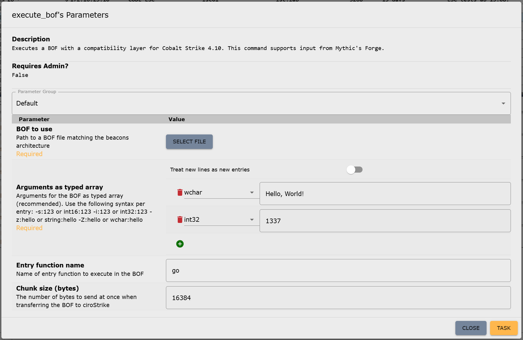 We cannot publish the server-side implementation because it is too closely linked to our beacon. However, it is not really difficult to do it yourself. To use the BOF loader in the beacon, you only need to assign a new command in the Mythic payload container, which is then used to call the loader, e.g., execute_bof. This command only requires a file parameter for the BOF itself and a parameter of type “typed array,” which is used for parameterizing the BOF. We will explain why this typed array is important in more detail shortly. Optionally, the name of the entry point function (if different from go) and a chunk size for the transfer of the BOF file can be specified as parameters for the execute_bof command. You can read more about how to add new commands in Mythic, but if you have your own beacon, you should already be familiar with this: https://docs.mythic-c2.net/customizing/payload-type-development/adding-commands/commands