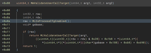 If we decompile MmValidateUserCallTarget, it quickly becomes clear that this has something to do with CFG as can be seen by the call to MiIsProcessCfgEnabled because otherwise simply 1 is returned.