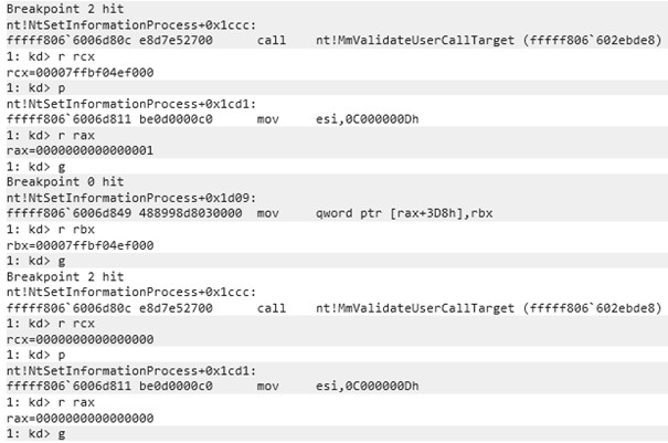 A null pointer is very obviously not a valid call target; however, let’s quickly prove that this function isn’t successful by using a kernel debugger and placing a breakpoint on NtSetInformationProcess+1ccc, which is where MmValidateUserCallTarget is executed. Additionally, we placed a breakpoint on NtSetInformationProcess+1d09 to show where the IC gets set in the KPROCESS struct. As can be seen, when the address for the IC is passed to MmValidateUserCallTarget, the function returns 1 and KPROCESS is updated. However, when a null pointer is passed, 0 is returned.