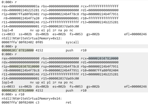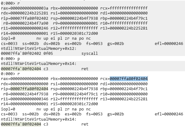 In the first blog post we briefly mentioned that we recommend attaching a debugger to a program with and without an IC set to check the values of registers after syscalls but didn’t dive deeper into it. I attached WinDbg to a random process and set a breakpoint on a random syscall (ntdll!NtWriteVirtualMemory+0x12). As can be seen in the following screenshot, rcx was changed to the address of the instruction after the syscall, that is the ret instruction. Also, r10 was zeroed.